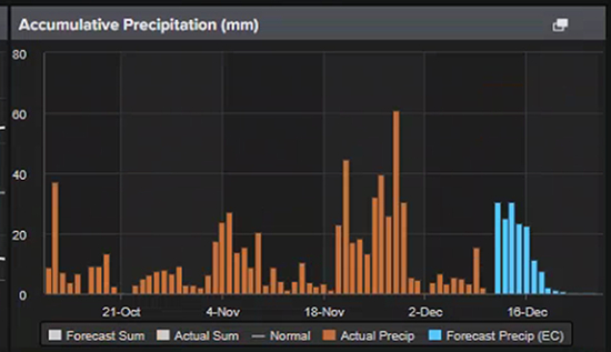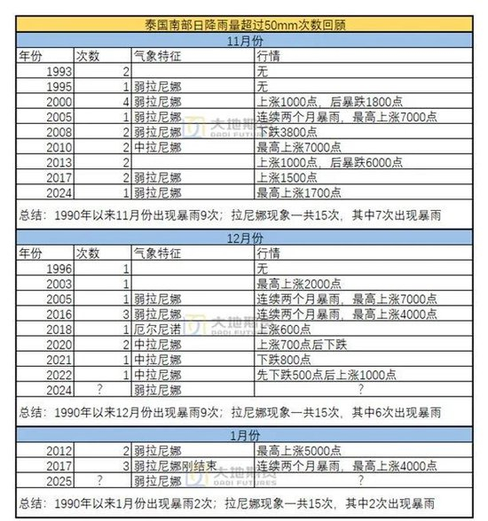 今年11、12月份面临两次大规模降雨,降雨量相比历史同期偏高,并11月底已经在泰国南部引发洪涝灾害,导致上游原料产出受限、出货节奏放缓。因此市场参与者担心12月份、1月份是否可能继续出现大规模降雨,并希望了解对行情的影响程度。