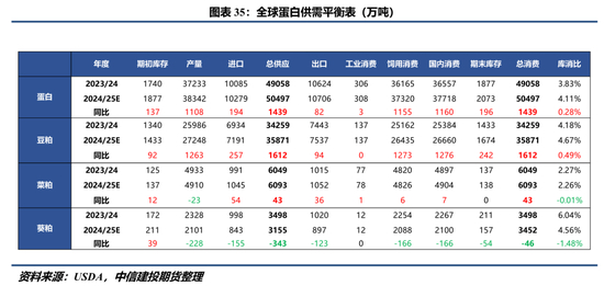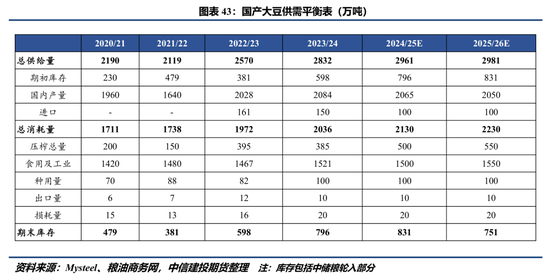 2024年国产大豆整体含油率较高,同时大豆价格偏弱,吸引国内油厂采购高油大豆进入压榨,对国产大豆需求形成短期提振。此外,不排除政府或在2025年通过发放压榨补贴的方式刺激企业将国产大豆用于压榨,为此我们认为2024/25年度国产大豆整体消费量预计有小幅提高。