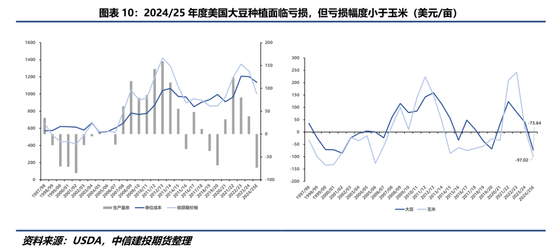 种植本身是一种微观经济行为,种植主体期望实现成本最小化或者利润最大化,因此是否进行种植以及种植何种作物本质是对成本收益的分析。图10左图记录了1997年以来美豆单位生产成本、收获期价格[2]以及生产盈余[3]走势。2020/21年度美豆种植利润从此前天量库存(2018/19年度中美贸易争端导致)引致大豆价格大幅下行并导致种植亏损中恢复,近几年种植大豆均能获得正收益。但2023/24年度以来,美豆价格步入下行通道,并最终导致2024/25年度种植收益转为亏损。线性的经济学直觉是当年的种植亏损会导致农户在次年减少种植,降低供应,带动价格回升,并再度提振未来农户种植意愿,表现为供应的重新增加,形成动态传导。