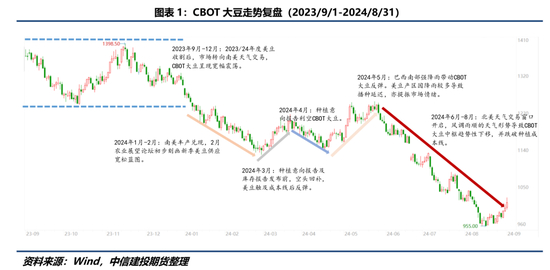 经历了后疫情时代高位震荡的一年后,2023/24年度是以CBOT大豆作为定价中枢的豆系商品“由盛转衰”的一年。2023年9月-12月,CBOT大豆在围绕南美天气的交易中宽幅震荡,随后2024年年初南美丰产的兑现、2月农业展望论坛报告以及3月USDA种植意向报告打响了“全球大豆供应向宽松转变”的第一枪。尽管5月初巴西南部南里奥格兰德州突发的强降雨给CBOT大豆注入些许上行动能,但进入6月后,北美大豆生长季风调雨顺的天气形势导致CBOT大豆开启了约2个月估值中枢下移的过程,随着市场不断押注美豆丰产兑现,CBOT大豆最终跌破种植成本线。
