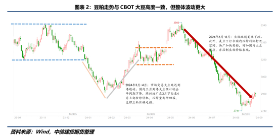 隶属于CBOT大豆定价体系的DCE豆粕的走势向来与CBOT大豆高度一致,年内受CBOT大豆下跌影响,整体中枢亦回落至3000下方,但美豆从成本传导至豆粕过程中还受到汇率、CNF报价以及国内到港政策等诸多因素的影响,这些因素放大了豆粕价格的波动。例如2024年3月-4月国内交易大豆延迟到港叙事,此类外生题材加大了豆粕价格的波动;2024年6月-8月,除了美豆从成本端传导外,美豆的下跌也令国内压榨利润回升,驱动油厂加快买船,国内大豆供应充足预期亦打压豆粕估值。