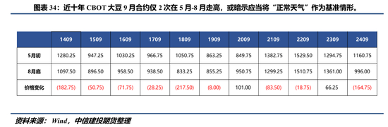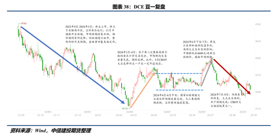 2024年6月-8月:北美生长季天气风调雨顺,CBOT大豆中枢开启下行通道。随着播种工作完成,市场正式进入北美天气交易期,适宜的雨热条件贯穿整个美豆生长季,优良率表现良好、土壤干旱水平处于低位等令多头叙事寸步难行。此间USDA月度报告亦不断强化新季美豆供应宽松叙事,8月报告更是给出5.6亿蒲的结转库存。随着时间推移,市场愈发押注美豆高单产、高产量、高结转库存,CBOT大豆中枢持续回落,并跌破种植成本区间1120-1150美分,最低在8月16日触及955美分。