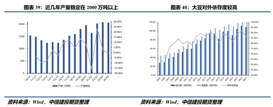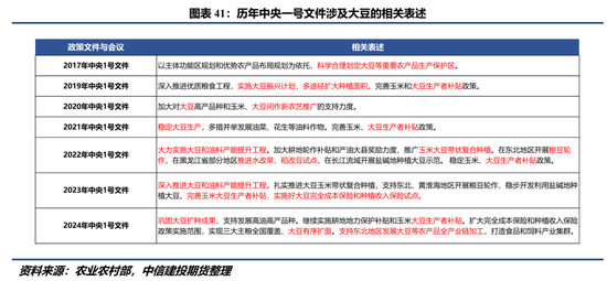 在此背景下,近几年宏观政策通过增加大豆生产者补贴、推广大豆与玉米复合种植等方式不断提高大豆种植的经济吸引力,我们初步预计2025年中央一号文件将继续保持“大豆产能提升工程”相关表述,明确鼓励大豆扩种的态度,向市场释放积极信号。