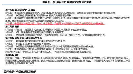 本节就这一话题从两个层面展开,一是特朗普上任后即刻对华加征关税有多大可能实现?二是如果关税政策兑现,对国内大豆供应以及豆粕价格会有多大影响?在此之前,我们先简要复盘2018年中美贸易争端前后豆系商品的表现,这也是市场在讨论这一话题时的重要参考经验。2018年-2019年中美贸易争端按照“起承转合”大致分为4个阶段,主要过程已由图15给出,此处不再赘述。