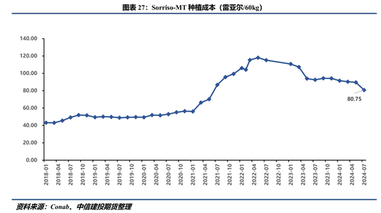 得益于化肥及农药成本大幅下降,2024/25年度巴西大豆成本显著下滑。按照Conab在 7月公布的成本测算,巴西大豆主要生产成本区间为633-959美分/蒲[6],不考虑土地租金、资本期望收益等机会成本的运营成本[7]仅在557-733美分/蒲左右。以Conab公布的农户销售价格测算,多数主产区的大豆种植仍能获得较好利润,这可能推动后期CBOT大豆及巴西大豆升贴水的进一步回落。若仅以最大主产州马托格罗索州的运营成本锚定,CBOT大豆距离绝对底部仍有200多美分的下跌空间[8]。