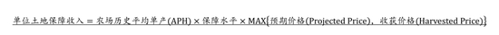 除了内生于农户收益函数的因素外,来自美国农业保险的潜在赔付也会影响农户的种植决策。对于大豆、玉米来说,最常见的是收入保险计划,其主要承保被保险人因天气风险、市场价格波动等因素导致的收入减少。通常每亩土地的保障收入可以用以下方法计算得出:
