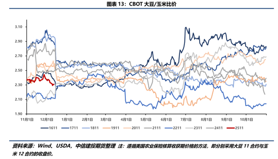 进一步地,今年的种植收益对于农户而言在某种意义上也相当于“沉没收益”,农户还会根据对未来种植大豆和玉米收益的预期(包含对成本和价格的预期)动态调整种植意愿,进而引致出对美大豆/美玉米比价的跟踪。近期大豆玉米比价大致在2.3附近,在历史水平上处于比较低的位置。USDA在10月给出了2025年种植成本的预估,大豆和玉米的完全成本分别为624.77美元/亩、871.09美元/亩,如果以55蒲/亩,188蒲/亩作为下一年度的综合单产,大豆和玉米的保本价格分别为1136美分/蒲、463美分/蒲,比价为2.45。这一结果暗示着如果以当前价格作为基准,明年大豆和玉米种植仍然面临亏损,且当下大豆玉米比价亦不利于农户种植大豆的积极性。