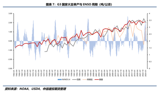 从统计数据上看,近几十年来美国与巴西大豆单产整体呈现震荡上升态势,表明其受ENSO的影响不显著,而阿根廷受ENSO影响单产波动幅度较大。在2022/23年度阿根廷经历罕见的“三峰拉尼娜”后,当年年度的大豆产量从上一年度的4600万吨骤减至2500万吨,降幅将近50%,背后原因便是拉尼娜使得阿根廷大豆产区持续干旱,最终导致产量大幅受损。