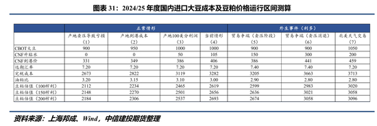 图31刻画了我们对于2024/25年度豆粕潜在价格运行区间的估算,大致分为七个情境,分别模拟了巴西产地从供应压力导致的亏损到实现盈利的报价变化、中美发生贸易摩擦以及明年市场交易新季北美天气下的情境,并测算了在不同压榨利润水平下的豆粕估值。