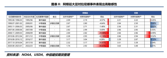 过去三十年共出现9次拉尼娜事件(连续事件记作一次),均贯穿北半球冬季。图8表明阿根廷大豆单产对拉尼娜事件表现出较高敏感性,在冬季拉尼娜事件后,次年春季收获的阿根廷大豆的单产共有8次出现同比下降,其中2022/23年度单产同比降幅达到40.41%。此外,拉尼娜事件强度与单产减产幅度之间没有特定联系。例如在2008年与2017年偏弱的拉尼娜事件影响下,减产幅度也达到了25%以上。巴西情况则与之不同,在经历拉尼娜事件后,单产仅2次出现较为明显下降,多数年份单产均同比增长。图7表明巴西大豆单产在年际尺度上整体趋势向上,相比之下,阿根廷农业“看天吃饭”的属性更加明显。整体来看,由于阿根廷大豆对于拉尼娜事件的高敏感型,今年冬季可能发生的拉尼娜事件仍然令该国大豆5200万吨产量的实现充满变数,而巴西大豆产量受拉尼娜事件影响相对较小。