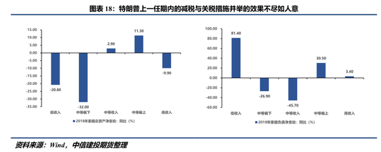 此外,特朗普在上一任期实施了《减税与就业法》,其中部分减税措施将在2025年到期,特朗普此次竞选计划将个人所得税减税等措施永久化。上一任期里,特朗普将减税与关税措施并举,但效果似乎不尽如人意。图18表明2018年低收入家庭负债增长幅度显著高于其余几个群体,同时总资产增长出现显著下降。一种观点认为两项税收政策效用具有不对称性,被加征关税的进口商品多是常见的生活用品与中低端消费品,对低收入家庭影响更大;而减税政策更利于高收入家庭,对低收入影响甚微。基于此,考虑关税给中低收入家庭带来冲击的不确定性,特朗普上任后即刻推行关税政策落地可能面临阻碍。