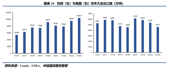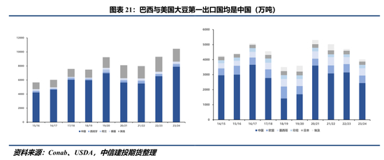 从总量上看,巴西和美国近几年出口数量分化较大,巴西出口数量在近几年稳步增长,2023/24年度出口数量突破1亿吨;相反,美国出口数量近几年持续回落,2023/24年度出口数量4613万吨。