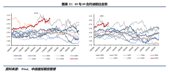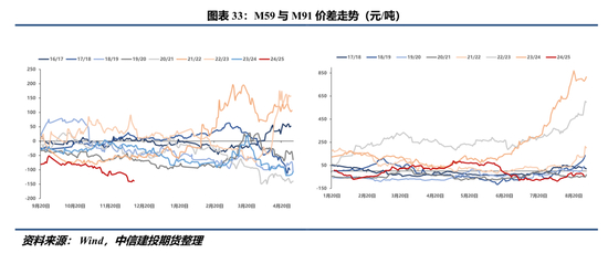 明年北美种植季开启至9月美豆收获期间,我们以美豆丰产作为基准情形(图34),M09单边维持逢高沽空思路,M91倾向逢高反套,直至天气形势可能逆转2025/26年度美豆平衡表供需格局,跟踪线索包括实时降雨预报、USDA周度种植报告(Crop Progress)、月度供需报告、季度种植面积报告、季度库存报告等。