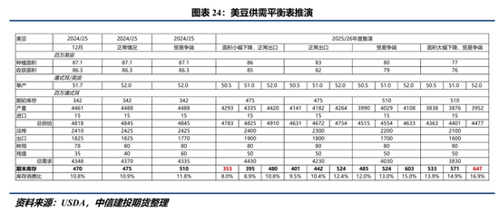 2025/26年度考虑多重情境下的推演更为复杂。通过对种植(收获)面积、单产、出口进行一系列假设,可以看到产量在38.38亿蒲至44.2亿蒲区间变动。在需求端,考虑美国生物柴油政策对美豆压榨影响显著,同时该政策不确定性极大,我们将压榨量设定在22亿蒲至24亿蒲区间,配合16亿蒲(贸易争端发生)至19亿蒲(正常情况)的出口预估,种用和残值保持稳定。上述设定共同使得2025/26年度美豆期末库存在3.53亿蒲到6.47亿蒲区间波动。