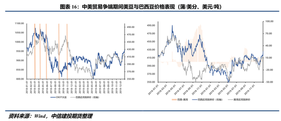 图17左图刻画了贸易争端期间DCE豆粕与巴西近月到岸价的走势,二者高度相关。其中缘由不难理解,美豆出口受阻后,全球最大买家中国自然会将采购需求转向巴西,随之转移的还有卖方议价权。此外,通常而言,每吨大豆压榨出的豆粕产值占总收入的65%,豆油产值占总收入的35%。因此豆粕对大豆成本的依赖度要显著高于豆油。豆粕与巴西近月到岸价走势高度一致亦暗示国内市场对豆粕定价存在与海外经纪商类似的行为,即抢跑并过度计价,然后在贸易关系出现缓和后回吐涨幅。
