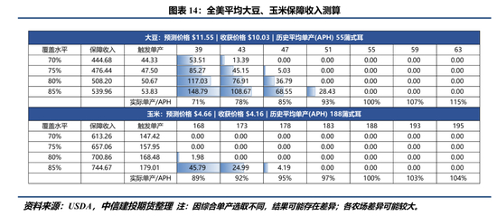 其中APH由保险机构根据农场历史的单产走势推算得出,属于外生给定;保障水平可以理解为农户购买保险的覆盖程度,通常从50%到85%不等;预期价格为2月期间美豆11月或美玉米12月期货合约均价,而收获价格为10月期间美豆11月或美玉米12月期货合约均价。