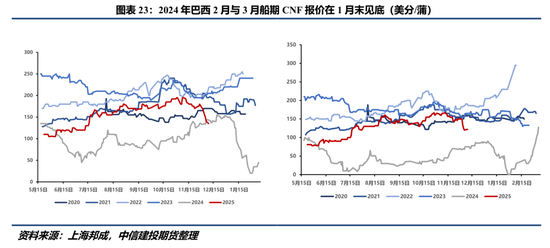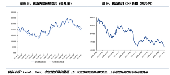 进一步地,我们选取巴西核心大豆生产城市Sorriso为代表。该城市2024/25年度运营成本约80.75雷亚尔/60kg,折约640美分/蒲。考虑大豆从Sorriso运输至港口的内陆运输费用以及从港口运输至国内的海运费用,大致以280-320美分/蒲的基差(CNF Basis)作为假设,估算出巴西大豆最低到岸价(不含税)约920-960美分/蒲。12月巴西大豆近月到岸价约425-440美元/吨,折约1160-1200美分/蒲,暗示国内进口大豆成本整体仍然至少有200美分/蒲的下方空间。