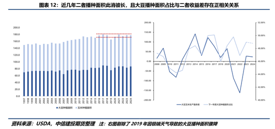 事实上,农业土地的性质决定了农户可以在部分作物间轮换种植,例如由于播种区域的重合度较高,大豆和玉米天然存在争地现象,因此种植决策还与种植各类作物的比较收益相关。图12右图表明近十年来当年年度大豆种植面积占大豆和玉米总面积的比例与上一年度大豆和玉米种植收益差存在正相关关系。因此,2024/25年度大豆亏损是否会导致2025年大豆播种面积下降还取决于当年玉米的种植收益。上文图10右图展示了1997年以来种植大豆和玉米的种植收益,2024/25年度大豆玉米种植收益差约为23美元/亩,较上一年度的27美元/亩略有下降,暗示着基于上述规律,理论上农户可能会在2025年减少大豆种植面积在总面积中的比重。