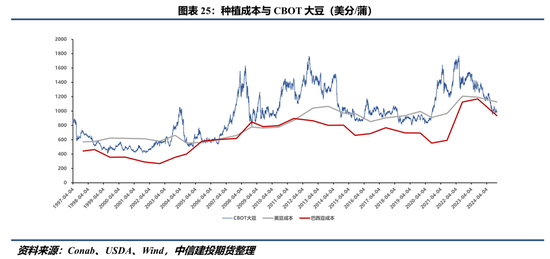 历史上,CBOT大豆曾多次跌破美豆种植成本,2次跌破巴西大豆种植成本。近10年CBOT大豆2次跌破美豆种植成本,但却均在巴西大豆种植成本之上。尽管从包络线角度,美豆种植成本更贴近CBOT大豆下沿,但美豆与巴西大豆种植成本彷佛两道关卡,在供应宽松时期给CBOT大豆下行带来阻力。当前CBOT大豆已较长时间跌破美豆种植成本,我们在下文将通过巴西大豆种植成本来大致锚定CBOT大豆在2024/25年度运行的下边界。