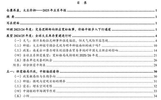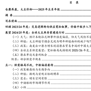 风险提示:南美丰产证伪; 国内大豆到港政策超预期; 2025年大豆种植面积超预期下调; 特朗普贸易政策超预期;美国通胀超预期引致大宗商品价格中枢超预期抬升等。