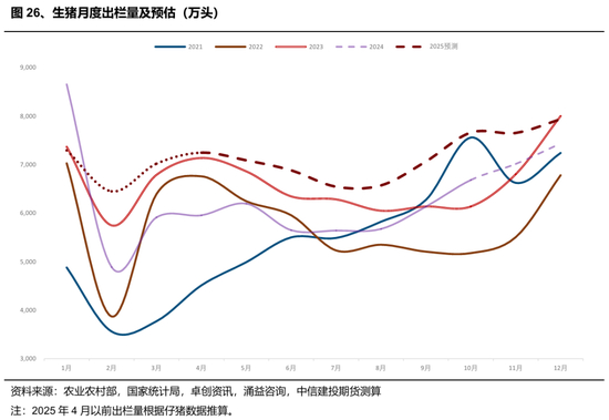 25年或面临新一轮的出栏扩张。24年供应缺口导致二、三季度价格偏强表现,而四季度供给端的逐步恢复会给价格带来压力。我们认为,根据仔猪及其对应的生猪出栏预期来看,25年受到供给侧持续恢复的影响,供给增长的延续可能大概率持续至春节后。从25年全年出栏量展望看,出栏压力可能强于过往4年,处于近年来最高水平。