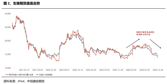 2024年2月至4月:弱预期修复阶段。全国各地春节后生猪价格回落探底后企稳回升,屠宰量节后逐渐爬坡恢复。2月份7kg仔猪价格持续回暖至440元/头,基本超越盈亏平衡线,母猪养殖现金流压力暂时缓解。受南方多地肥标价差扩大带动,看涨情绪由南向北传导,南北方多地二次育肥抄底增量进场,部分头部养殖企业主动缩量,各方因素推动猪价偏强上涨。市场押注下半年产能去化预期,盘面2407、09、11合约迎来趋势性上涨,弱预期逐步修复。