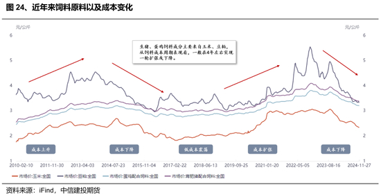 成本端的共振下行周期或还未终结,25年生猪面临成本侧与供给侧的双重压力。从生猪饲料成本周期表现看,一般在4年左右实现一轮扩张或下降。2024Q3我国生猪饲料价格降至3.17元/公斤,降至2021年以来低位。饲料成本主要取决于玉米、豆粕价格变动情况,而2025年玉米、豆粕市场仍需要时间出清,快速实现周期逆转的驱动力量暂不明显,预计饲料成本25年仍将低位运行。