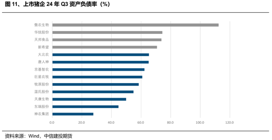 产能去化主体已从散户进一步扩散至逆周期调节能力较弱的集团厂。我们统计的13家上市企业中,24年Q3还有4家猪企的负债率超过70%,负债率低于50%的仅有3家。负债率过高的企业在融资上可能面临更大难度,财务成本的提升进一步导致总成本居高不下。本轮产能去化周期中,对于负债率高的企业,已经因债务逾期等问题先后步入重整与申请重整的局面,而资产状况较好的企业仍延续逆势扩张状态。