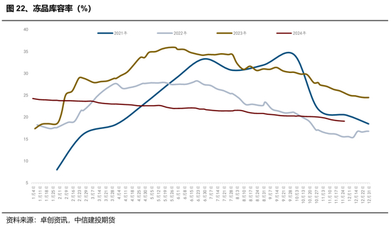 经历23年上半年集中入库后,受到23年低猪价影响,冻品出现亏损情况,24年冻品库容率一直延续去库趋势,屠企谨慎少量入库,维持鲜销为主,年内冻品去库趋势延续。冻品需求暂时看不到明显的弹性,仍以年内季节性波动为主。25年需要关注的点在于需求端冻品库容的潜在承接力量,或提供猪价上涨弹性,预计2025年库容率或先减后增。