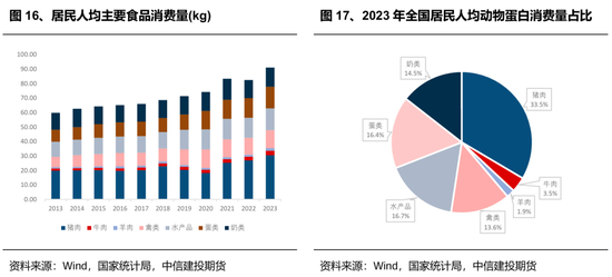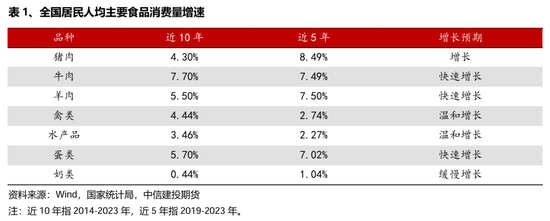 2013~2023年间,在我国主要动物蛋白消费中,猪肉消费占比稳定在33%左右,禽类、牛肉、蛋类以及羊肉占比均有提升,奶类占比则从19.6%下降至14.5%。过去10年,肉类年均消费增长仍然保持4.2%左右的年均复合增长率。