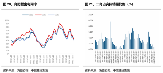 从24年二育表现形式看,仍以渐进式为主,暂未出现大幅集中进场情况。从二育占实际销量比重情况看,2月底以来,二育占比更多保持进一退一的滚动操作节奏,相较于22、23年,表现更为谨慎。预计散户24年12月21日冬至前二育出栏为主,下一轮二育弹性空间释放的前置条件是栏位利用率重回20%以下,届时还需结合猪价情况综合判断市场承接意愿,25年Q1可能仍面临压栏去库的出清压力。