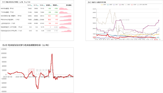 价差方面,上周电/工碳价差环比持平于-3250元/吨,电池级氢氧化锂/碳酸锂价差收敛840至-7450元/吨。