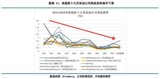再投资率是资本支出与经营现金流(CFO)之间的比率,通常这个比率可以反映公司增长策略的积极性及其对业务扩张或维持运营的投入强度。美国页岩油企业总体的再投资率仅十余年出现了持续下滑,这种格局可能不太会因为政治环境的改善而改变。