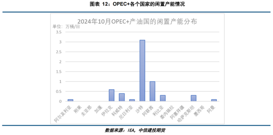 OPEC+产油国仍具有较高的闲置产能,截至2024年10月,闲置产能总计为620万桶/日,参与减产的国家闲置产能总计为590万桶/日。其中沙特闲置产能高达310万桶/日,其次是阿联酋,闲置产能为100万桶/日,排在第三的是俄罗斯,闲置产能为80万桶/日。