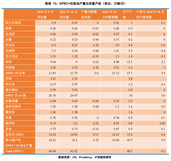 2、OPEC+内部变得更为团结了。OPEC+中一个非常重要的国家,阿联酋,也开始同意自2025年4月再逐步增产。OPEC+中一个重要的超产国伊拉克,已经在9-11月出现了连续三个月的产量下滑;另外一个超产国俄罗斯的产量,在9-11月已经与自身配额相差无几了。OPEC+内部的团结是沙特和俄罗斯外交的胜利,各个国家之间的团结也会促使他们对原油供应的控制力更强。