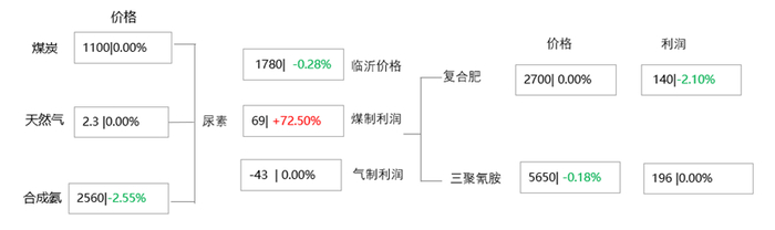 本周期产业链利润涨跌不一;上游煤炭、合成氨、尿素价格均有下调,利润小幅下跌;下游价格部分下跌,个别品种利润下降。