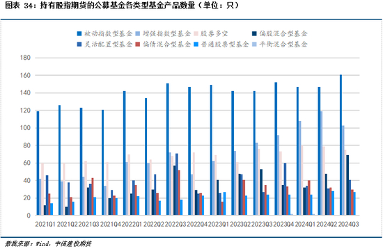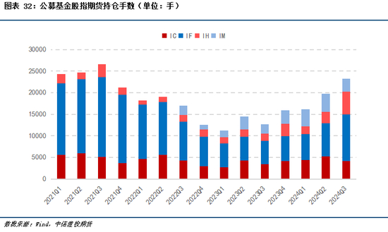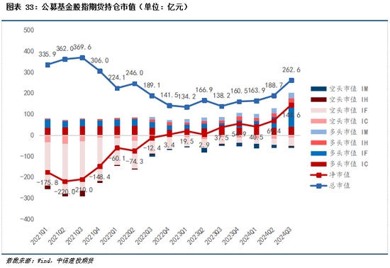 今年以来,公募基金股指期货总持仓持续增长,增长全部来自于多头端。2024年三季度末,共计65家公募基金旗下321只公募产品参与股指期货,多空总持仓达到2.3万手,持仓总市值达到262.6亿元,环比二季度分别增加18%和39%。