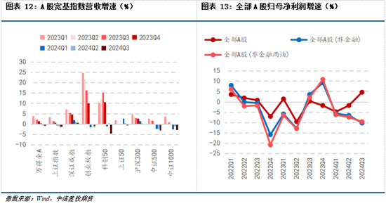 2024年前三季度,全A/全A非金融上市公司营收合计为52.5万亿元/45.7万亿元,同比下降0.84%/下降1.61%;实现归母净利润4.4万亿元/2.3万亿元,同比下降0.61%/下降7.31%。2024Q3全部A股归母净利润同比增速转正,单季度同比增长4.57%,累计同比降幅收窄;全部A股非金融归母净利润同比延续下行,单季度同比降幅扩大至10.3%。