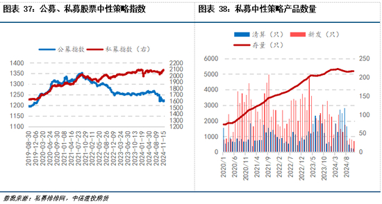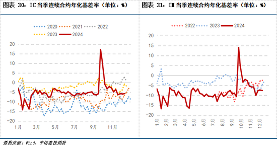 与此同时,今年以来私募中性策略产品发行量明显低于过去几年,1-11月,新发量仅为656只,2021-2023年同期分别为1418只、1132只、1302只。二季度以来中性产品数量开始萎缩,截至11月底,私募中性策略产品下降至5150只,低于去年年底水平。中性产品发行速度的放缓,对于股指空头套保需求的增量形成削弱。