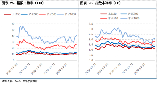 从PE来看,各指数估值较去年年末明显修复。截至到12月13日,上证50、沪深300、中证500、中证1000指数市盈率(TTM)为10.60、12.66、26.88、41.74,分别位于近10年以来的61.57%、53.53%、56.67%、60.39%分位点。从PB来看,各指数估值处于历史较低水平。上证50、沪深300、中证500、中证1000指数市净率(LF)为1.18、1.34、1.80、2.14,分别位于近10年以来的25.69%、20.39%、32.94%、20.2%分位点。