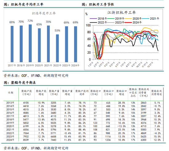 聚酯:2024年,聚酯供需双增,综合利润偏稳,不过受供应格局影响,内部表现分化,聚酯纤维好于聚酯瓶片。2025年,预期聚酯供应增长总体有所放缓,品种间仍有较大分化。长丝、短纤、瓶片的投产增速分别为3%、0.9%和12.9%。短纤供需格局预计最好,长丝也相对偏强,瓶片继续面临过剩压力。