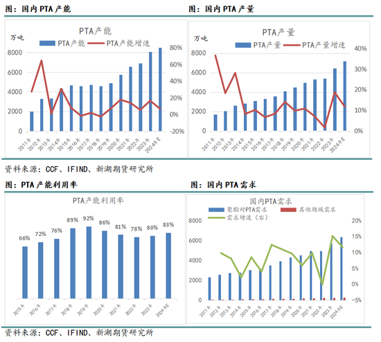 从产量上看,2024年国内PTA产量预计为7180万吨,较2023年增长758万吨,产量增速11.8%,高于产能增速,主要是今年PTA产能利用率有所提升。虽然2024年PTA加工费不高,但由于产业链上下游一体化格局较强,以及聚酯产出偏高,PTA年度产能利用率回升至83.5%左右。