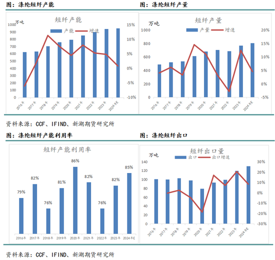 产量方面,2024年短纤产量预估为805万吨,相较于去年增加35万吨,增速4.5%,相较于去年放缓。短纤产量增速高于产能增速,主要是行业产能利用率相较于去年提升较多。2024年,涤纶短纤整体产能利用率提升至84.7%左右,较去年提升3%。