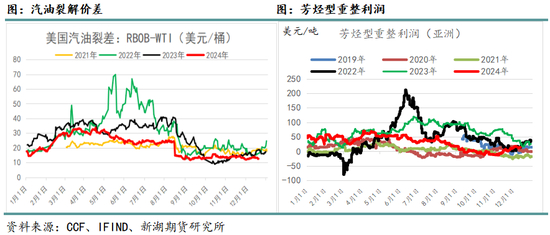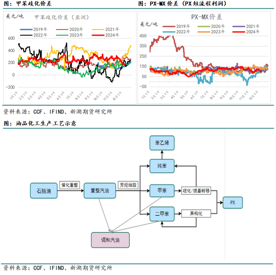 在2022-2024上半年之间,是汽油的景气周期。主要的背景是俄乌冲突造成俄罗斯成品油出口下降,加上全球炼厂产能受限,在需求旺盛的时候,油品供不应求格局加剧。美国作为全球成品油最大的消费地,在油品需求旺季缺乏高辛烷值的调油料,调油商在亚洲市场上购买甲苯、混二甲苯和PX运送到美国,对亚洲的PX供应格局产生影响。2022-2023年,汽油在二三季度利润较好,一方面重整环节芳烃出率不高,另一方面,芳烃组分用来生产油品利润要好于化工。在此影响下,PX产量下降,导致PX供需紧张,PX中长流程效益因此提升(短流程利润不高)。而进入2024年下半年,这种情况出现了逆转,汽油供应提升,而全球油品需求低迷,汽油由景气期进入过剩期,重整环节芳烃出率回升,且芳烃组分生产化工利润好于调油。在此影响下,PX产量回升,导致PX供应宽裕,PX中长流程利润压缩(短流程利润丰厚)。到2024年四季度,从PX估值水平来看,此前的调油带来的高溢价基本被挤出。
