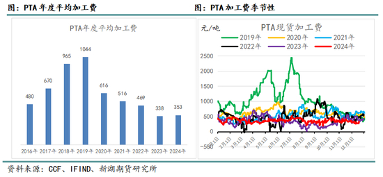 从产能上PTA看处在过剩周期内,需要低加工费来降低产能利用率,从而维持供需平衡。自2019年起,PTA年均加工费逐年下滑,2024年PTA平均加工费在353元/吨左右,相比2023年有所修复。