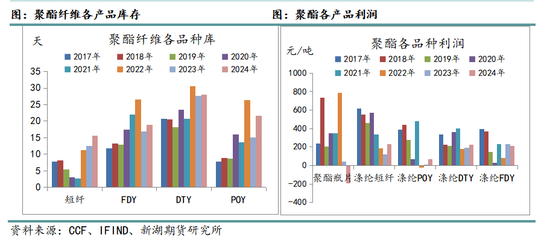 从库存和效益等微观指标看,2024年长丝工厂库存较2023年有所回升,不过利润指标整体好转,POY、DTY利润较2023年修复。整体来看,涤纶长丝行业较2023年继续转好,具体表现为产能利用率增加和效益提升,这也与企业在今年尝试新的保价限产方案有关。不过下游对高价原料承接力有限加上供应端开工率偏高,因此,长丝企业仍有一定库存压力。
