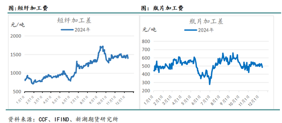 第二阶段 :2024年7月-9月,聚酯板块出现了大幅度的趋势下跌。从现货绝对价格跌幅来看,PX、PTA、短纤、瓶片自高点分别下跌22%、24%、10%和16%。一方面,上游原油价格重心下移,聚酯链成本走弱,不过PX及下游化工品表现明显弱于上游原油和石脑油。在本轮单边下跌过程中最为明显的变化是PX环节利润的快速压缩,PX-石脑油价差从上半年高点365美元/吨最低压缩至168美元/吨左右,PX-原油价差也大幅走弱,PX中长流程利润跌至历史低位水平。在PX利润压缩的过程中,下游聚酯的利润出现了明显修复,而PTA跌幅与PX相当,加工费仍在低位运行。因此,本轮聚酯板块的下跌过程中,产业链利润由PX环节向下转移至聚酯环节,长达2年半以来的上强下弱格局被打破。