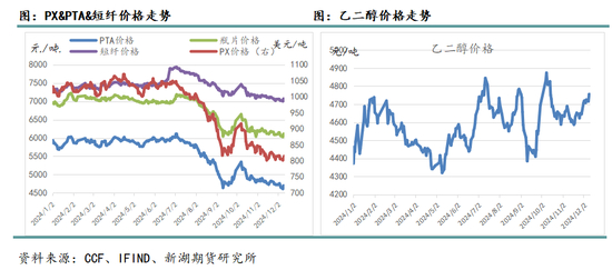 第四阶段:10月-12月中旬,聚酯板块整体震荡走弱,价格再度触及9月份低点。尽管国内的宏观政策在一定程度上有托底作用,但对聚酯产业链终端纺织品服装需求的改善仍未有明显传导效应。上游环节供应仍然高企,PX和PTA开工率高位运行,尽管10月份需求有一定程度的季节性好转,但并不具备持续性。另外,原油涨至区间高点后再度回落,区间高点有不断小幅下移的态势,而美国方面特朗普的当选也让市场对油价预期逐步悲观。在多重因素的↔下,板块重心再度下移。利润分配方面来看,PX环节利润再度压缩至低位,PTA加工费变化不大,聚酯环节利润偏好,其中短纤利润最好。