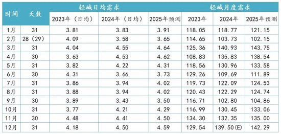 轻碱方面,整体市场需求预计稳定为主,其中增量项主要在于碳酸锂部分。从产业端了解到,碳酸锂生产所需轻碱比例实际能达到3:1(纯碱:碳酸锂),纯用作原料部分比例达2:1。2024年国内碳酸锂年产量预计68万吨左右,明年产量或能达90万吨,增速32%左右,从增速来讲,2025年较今年增速有一定放缓。轻碱部分统一按照2%的需求增速进行测算。