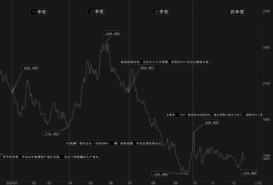 四季度整体进入宏观季:“924“新政”的出台带动大宗商品出现反弹,纯碱受情绪影响,驱动其估值有所回归。国庆假期后,随着对于宏观预期的大幅落空,盘面回归于理性状态,后续价格在预期与现实的交织下,逐渐回归于基本面弱现实逻辑之下。此外年底存在一定玻璃厂原料补库预期,对于盘面有一定的支撑,使得价格整体呈现逐渐震荡走弱的情形。